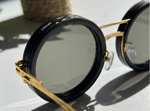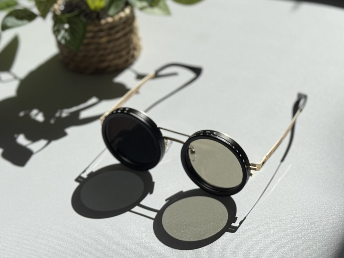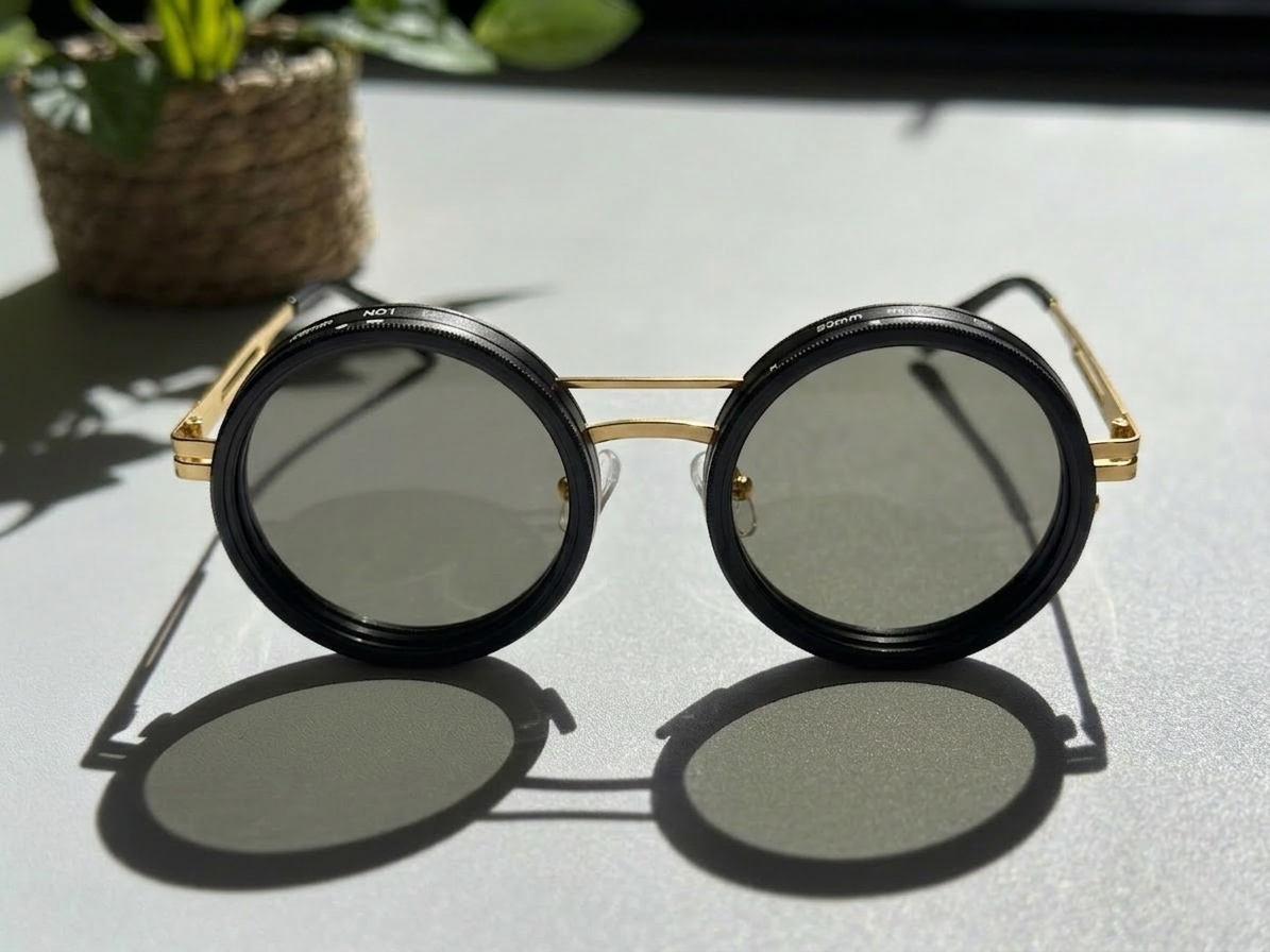 These circular sunglasses feature a bold black front frame, slim gold metal temples and dark ND lenses with 9‑step calibration, so you can fine‑tune the light for any Melbourne day.