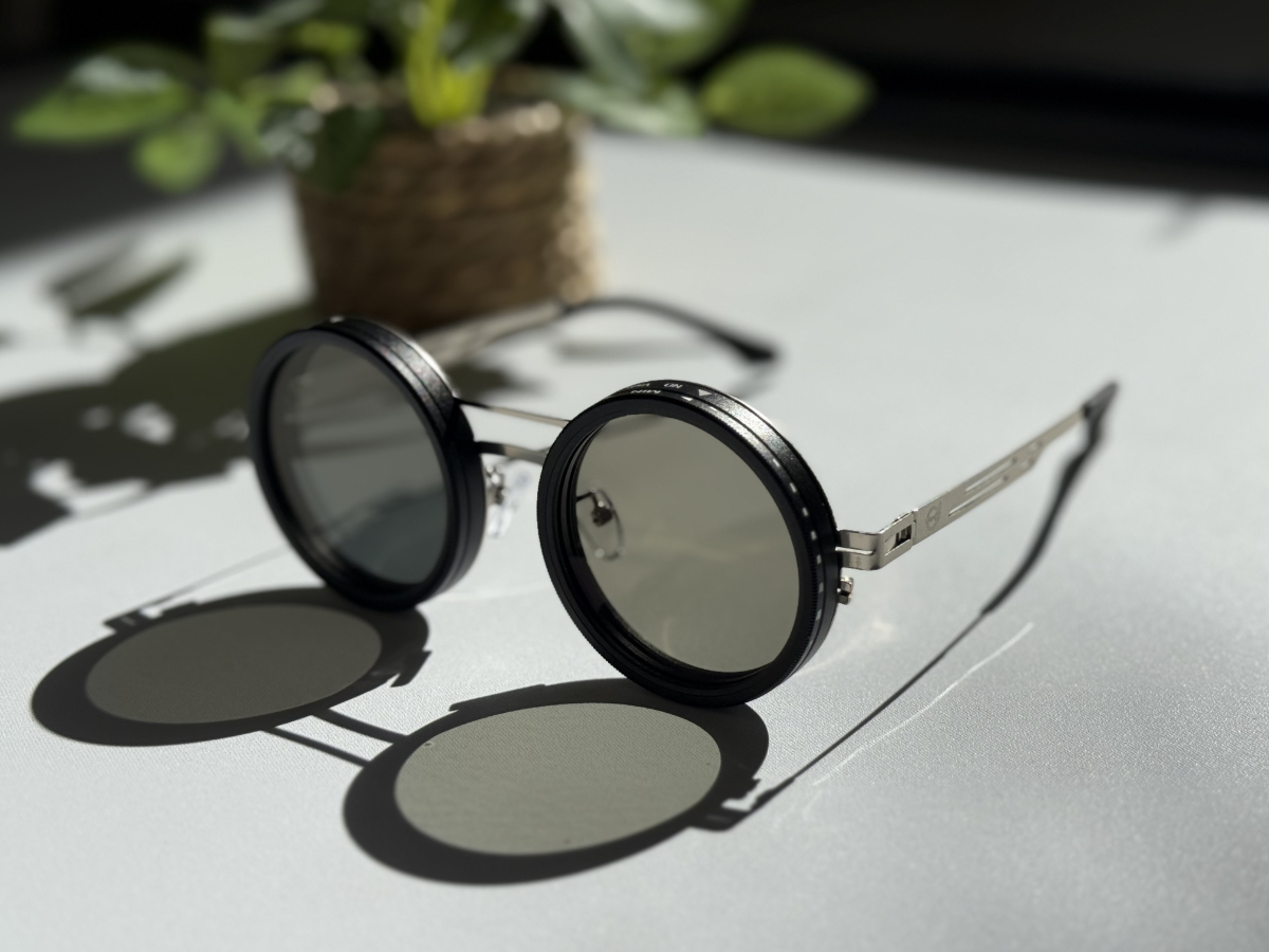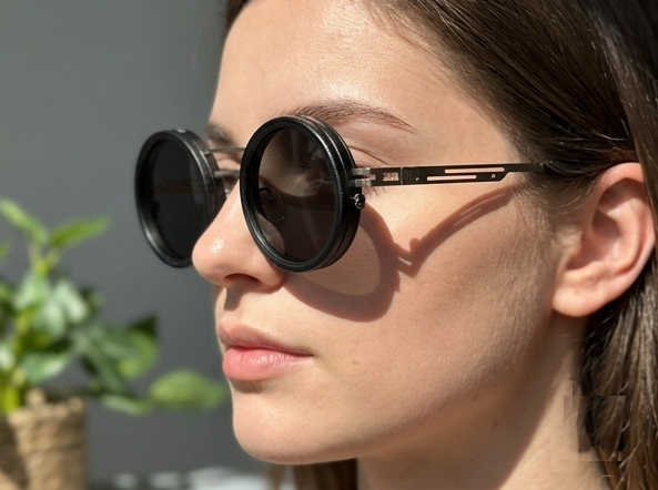 These circular sunglasses feature a bold black front frame, slim silver metal temples and dark ND lenses with 9‑step calibration, so you can fine‑tune the light for any Melbourne day.